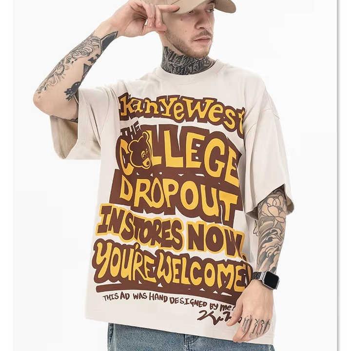 American Street KanYeWest Men's Women's Loose Hip Hop Short Sleeve T-Shirt Summer Oversized Casual Knitted Bear Letter-Printed