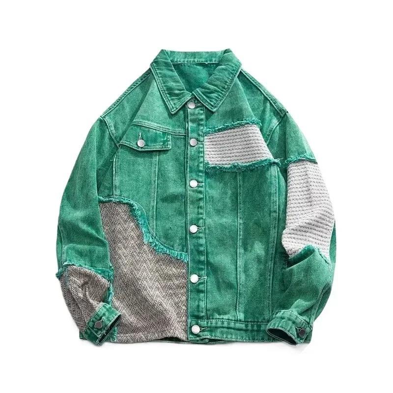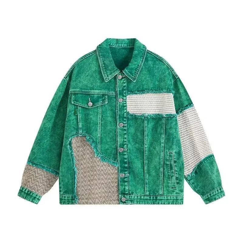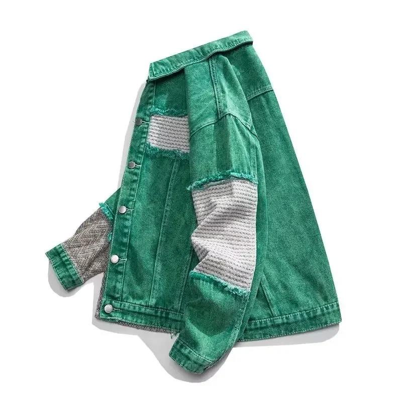 American Style Trendy Vintage Distressed Denim Jacket for Men Women Loose Fit Long Sleeve Spring Autumn Green Stitched Jacket
