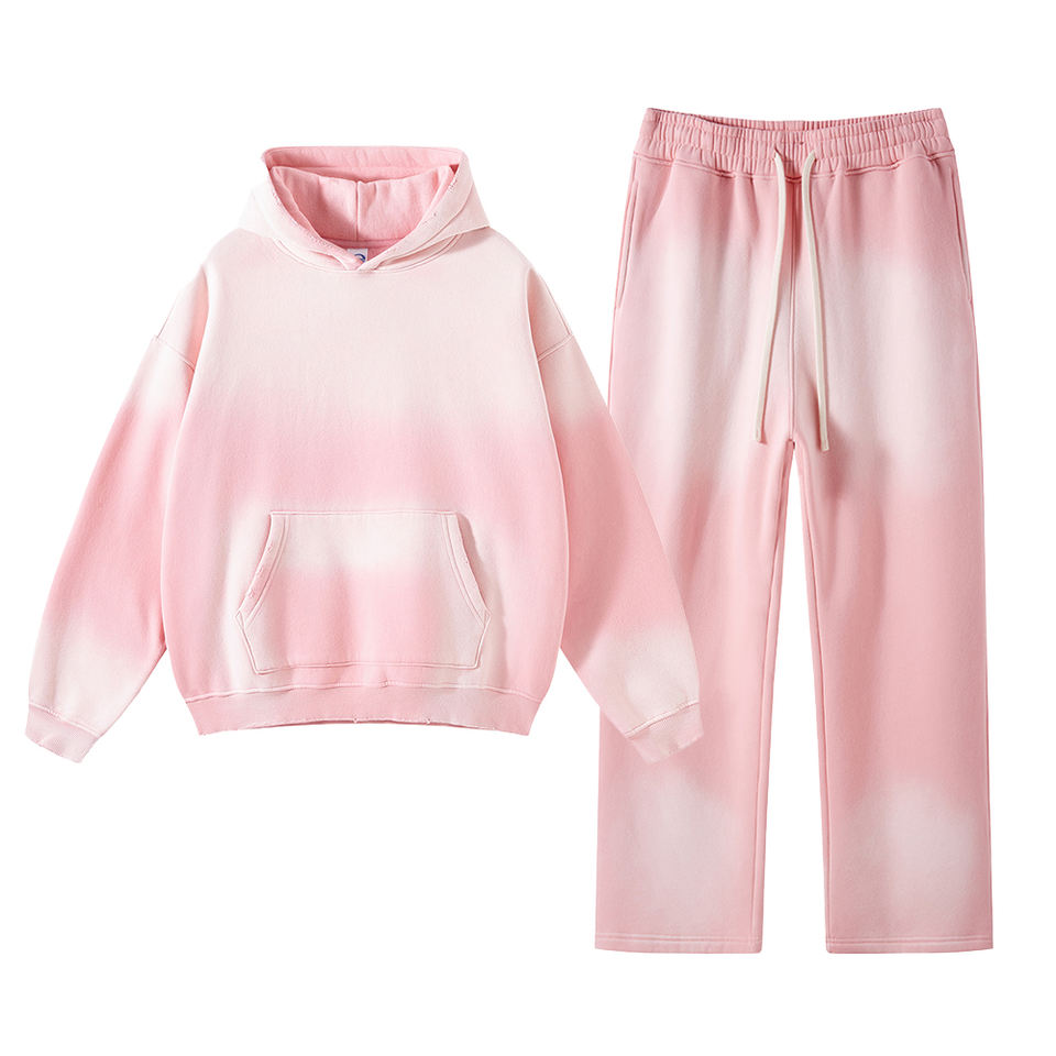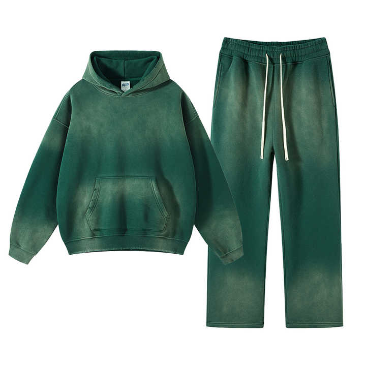 American Style Winter Streetwear Thick Cotton Sun Faded Vintage Spray Dyeing Hoodies and Sweatpants Set for Men Boys Unisex