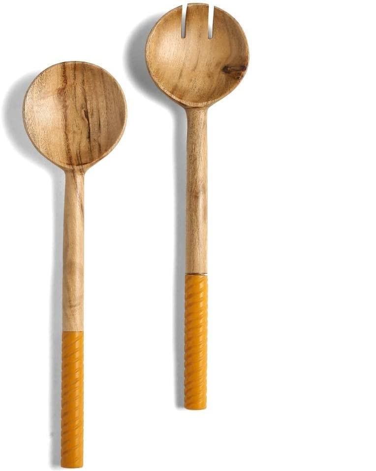 American style Black Resin handle acacia wooden 2pc set utensils for serving salad cutlery spoon and fork salad server