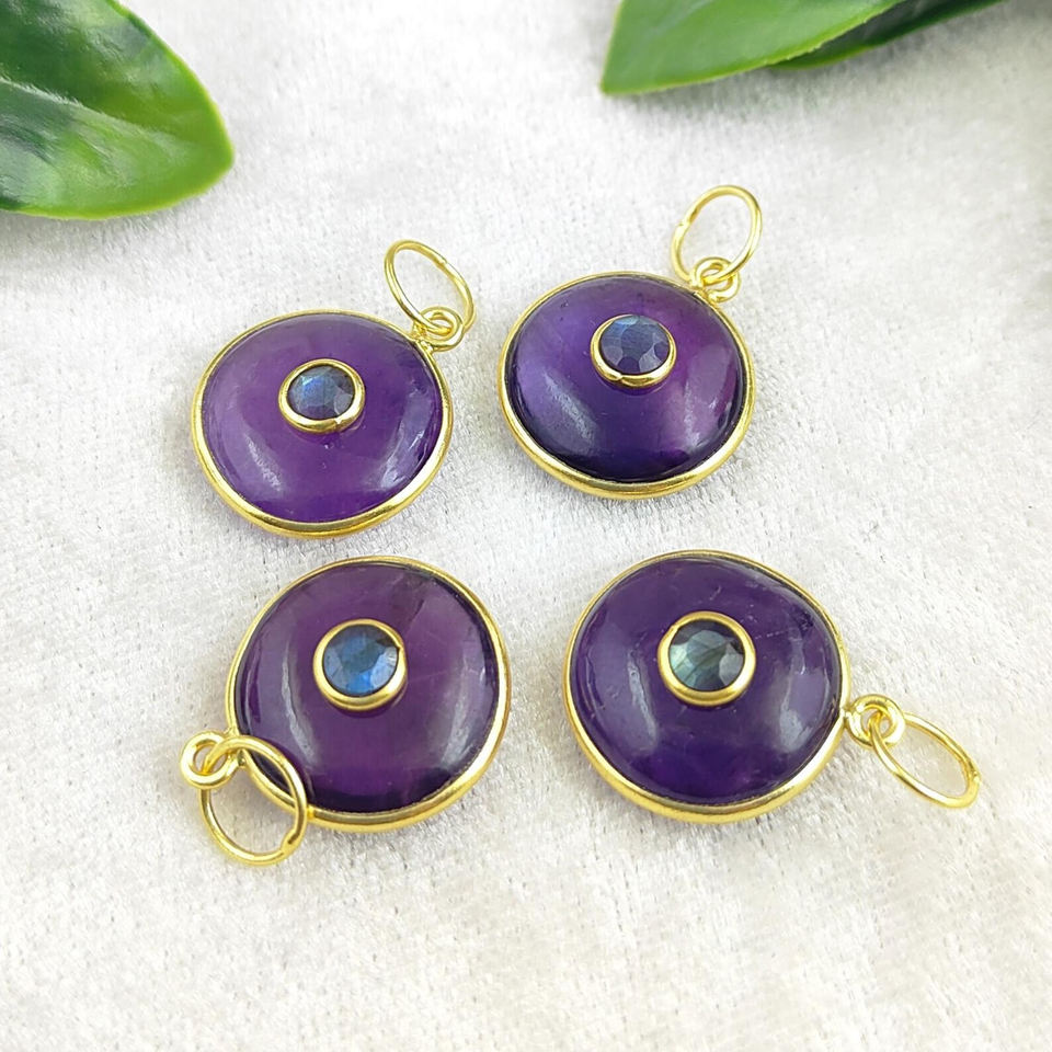 Amethyst Double Stone Pendant 925 Silver Bezel Handmade Round Shape Gold Vermeil Charm With Labradorite 925 Silver Coin Pendants