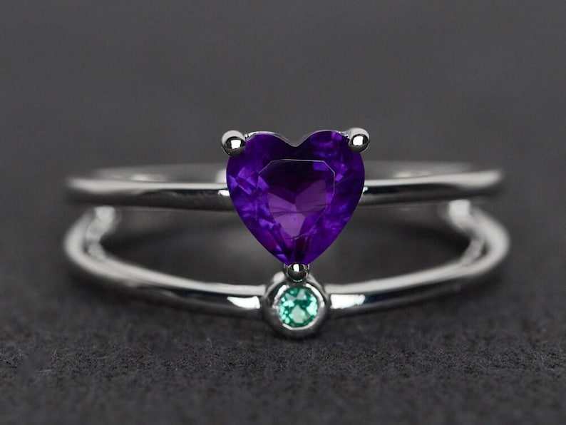 Amethyst Ring Double Band Heart Cut Engagement Ring Sterling Silver Purple Gemstone February Birthstone Jewelry