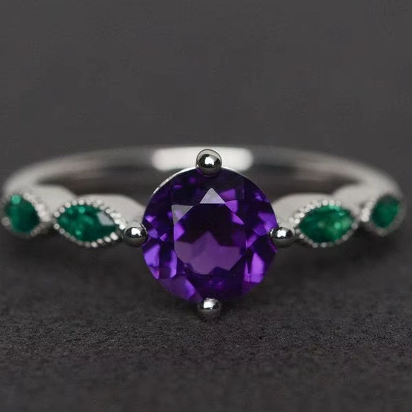 Amethyst Ring Round Cut Engagement Ring Sterling Silver Purple Gemstone February Birthstone Jewelry