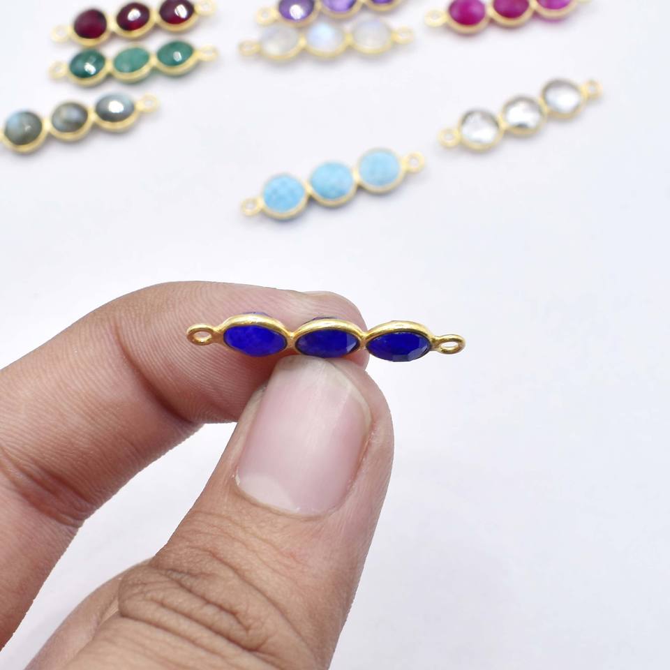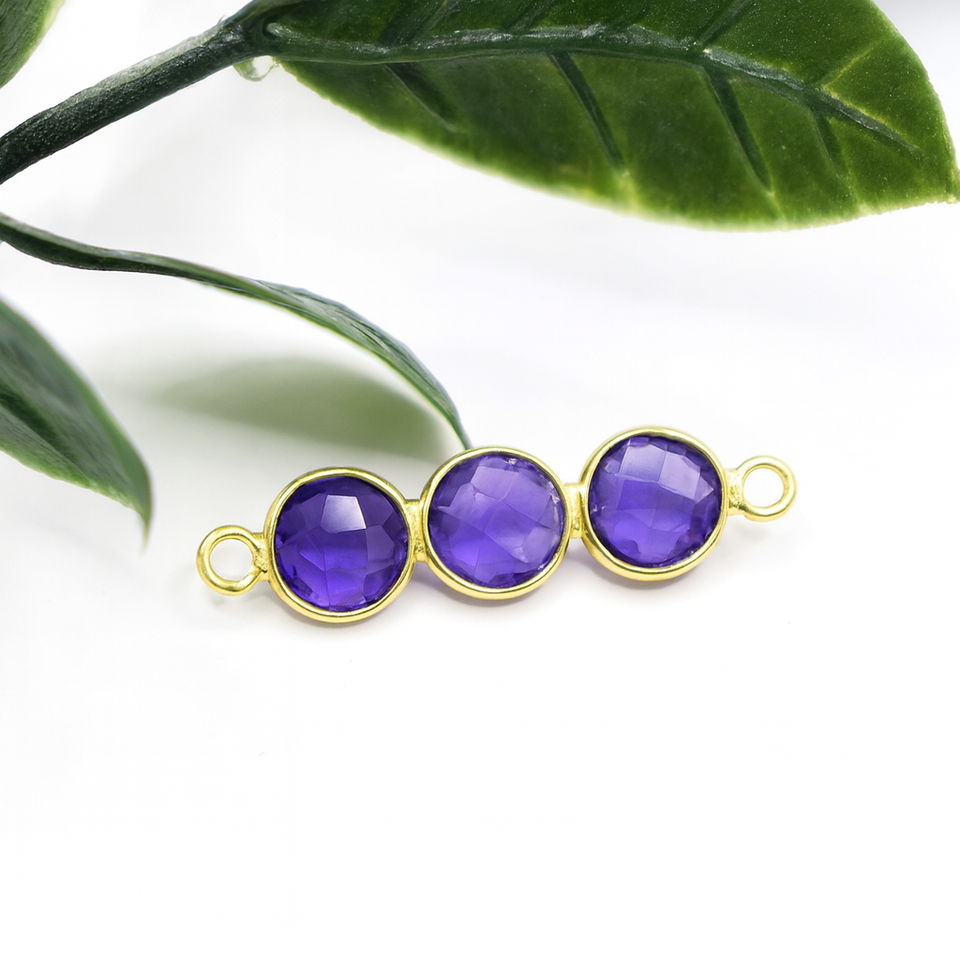 Amethyst Three Stone Bezel Connector Round Shape Faceted Gemstone Charm Gold Plated Handmade Bracelet Link Jewelry