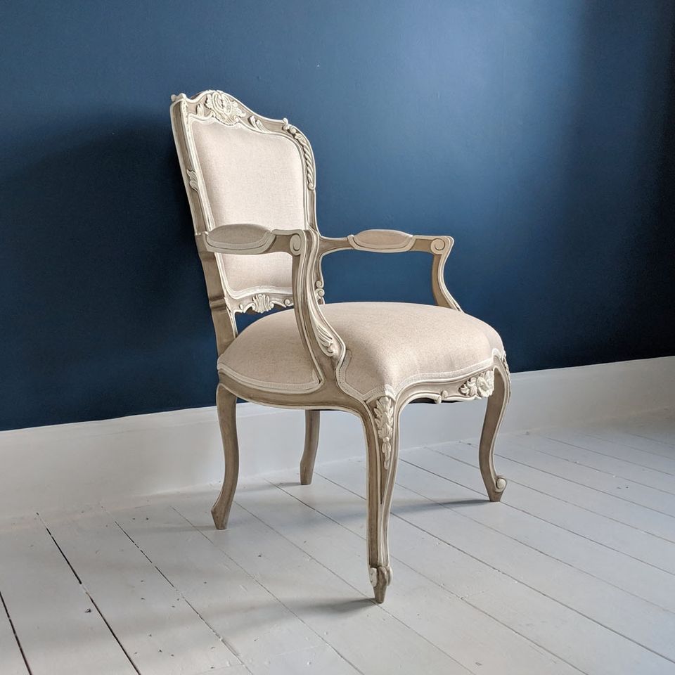 Amour French Armchair Handmade French Style Bedroom Chair with Mahogany Frame in Fawn Grey and Ivory Upholstery