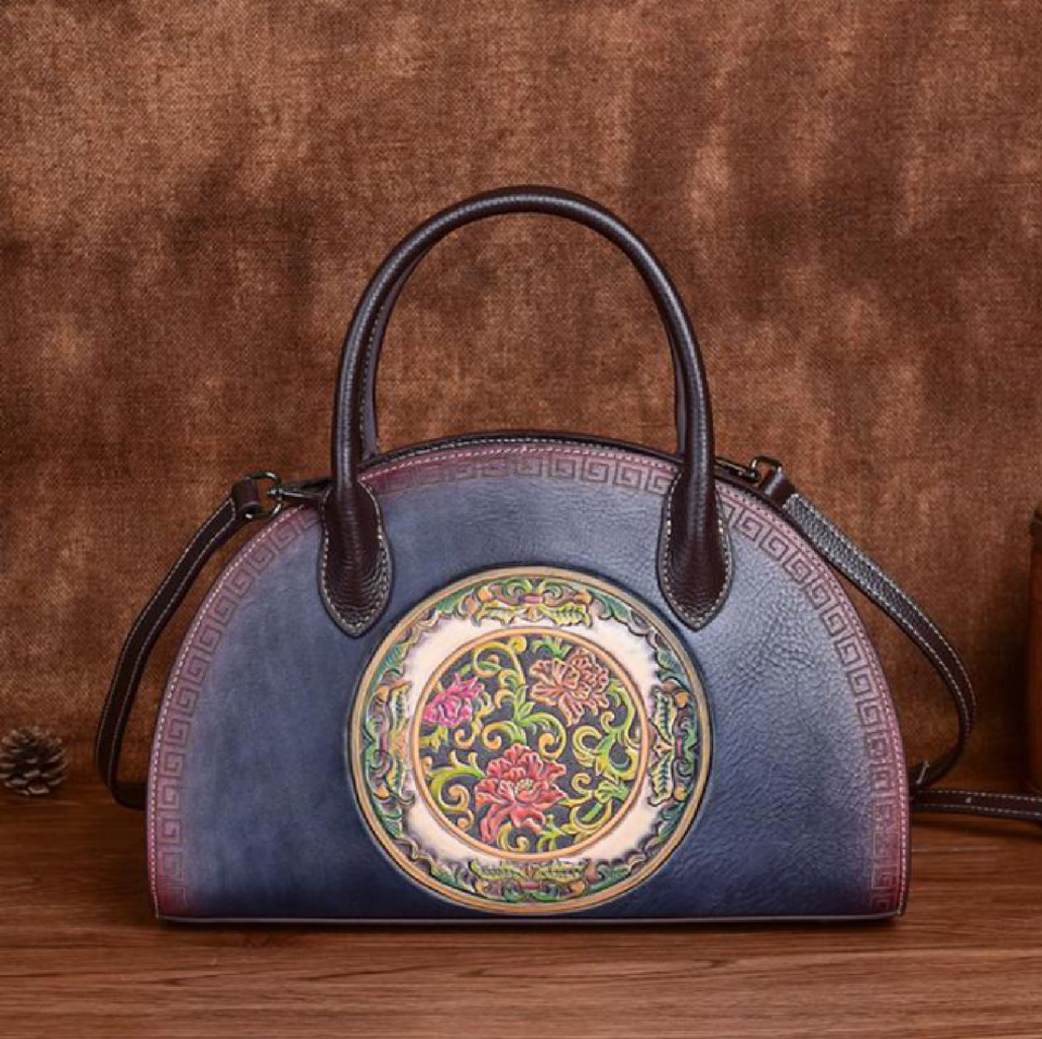 An elegant blue and brown leather handbag with a hand-painted floral medallion design, showcasing a beautiful blend