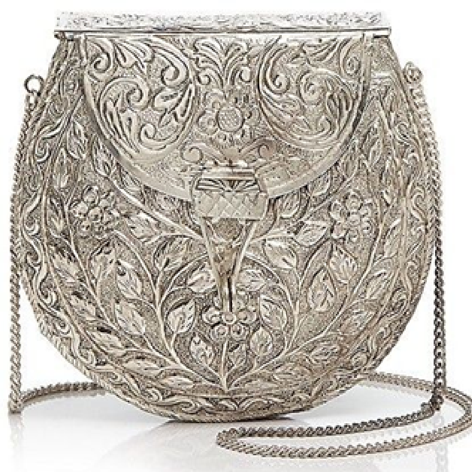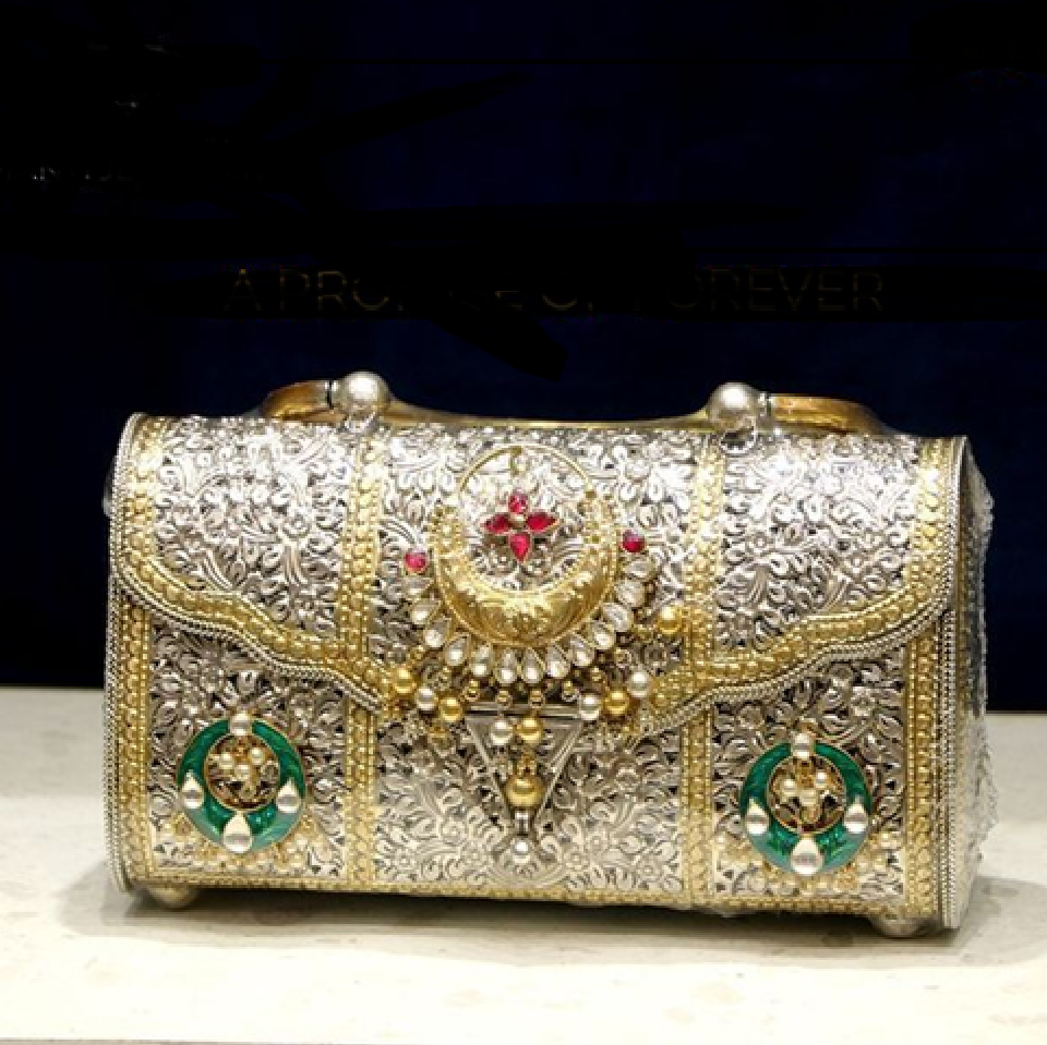 An elegant gold-toned clutch covered in a detailed gingko leaf pattern with a striking skull clasp. Available at wholesale price