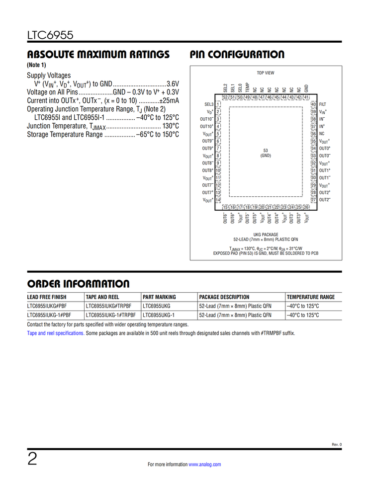 Analog Devices Inc. LTC6955IUKG#PBF ADI Fanout Buffer (Distribution) IC Ultralow Jitter 11 Outputs 3.15 3.45V 7.5 GHz QFN-EP-52