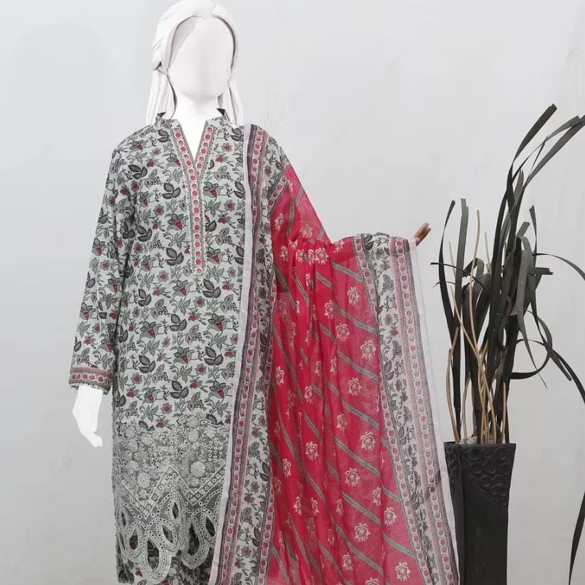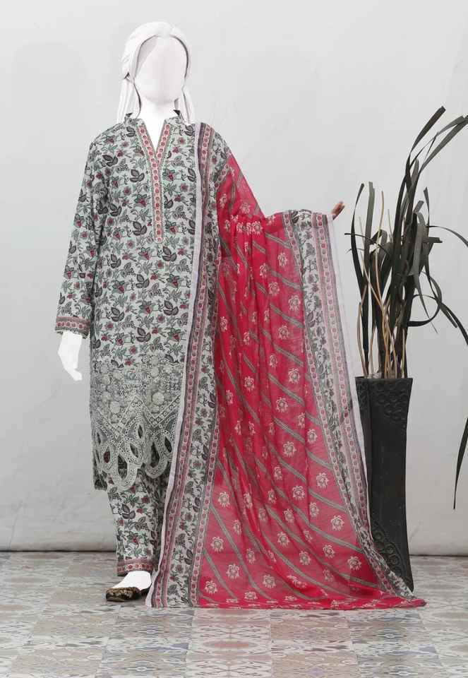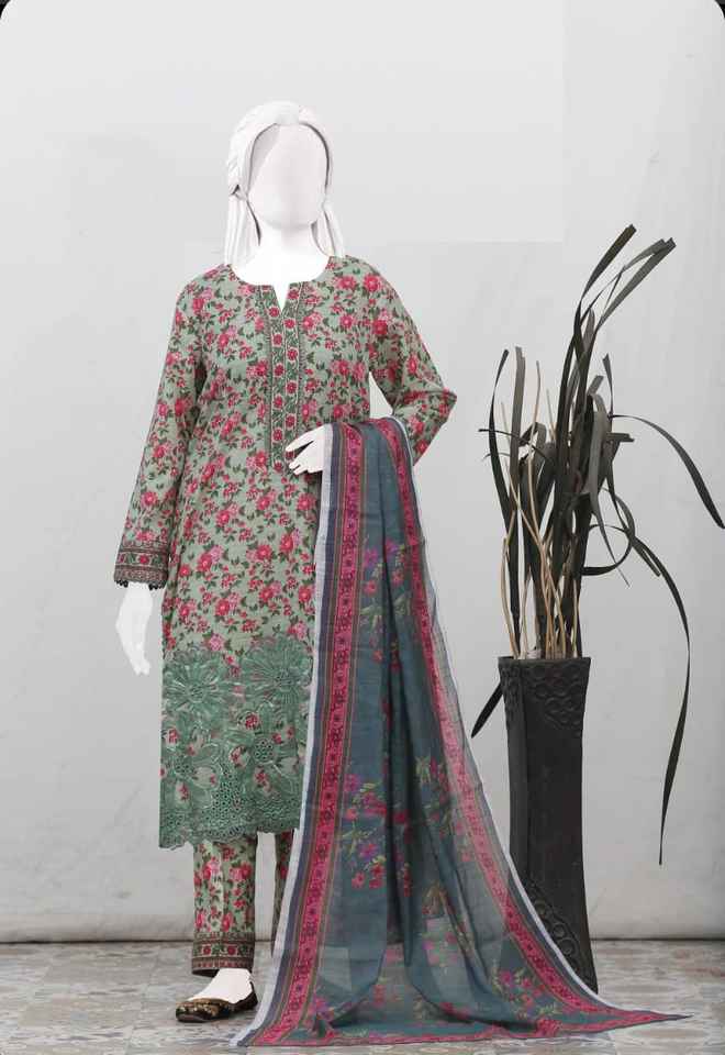 Anaya Noor unstitched 3-Piece Bana Dora Print With Organza Aplic Daman Suit Digital Print Full Embroidered Same Dyed Trouser