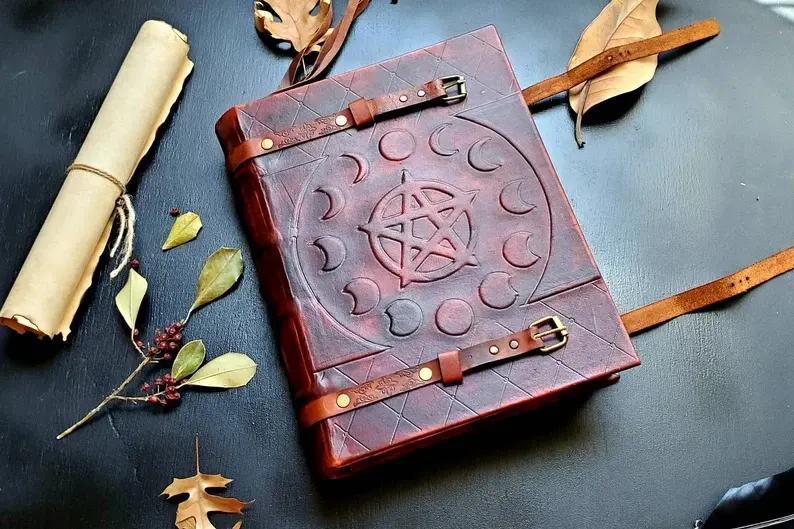 Ancient Leather Blank Grimoire Pentagram and Moon Phases