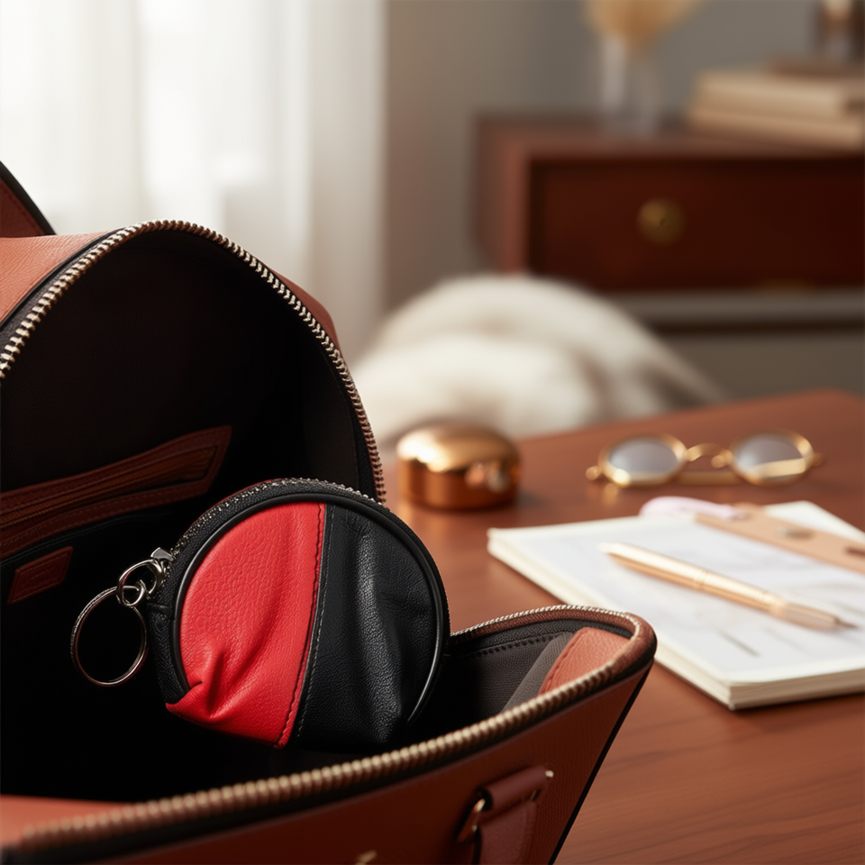 Angelina De Paris Round Wallet Red Black Genuine Leather Keychain Coin Purse Portable Zipper Closure