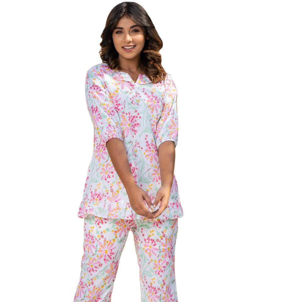 Ankle Length Night Suit Pajama V-Neck Summer Printed Cotton Floral 2 Piece Set