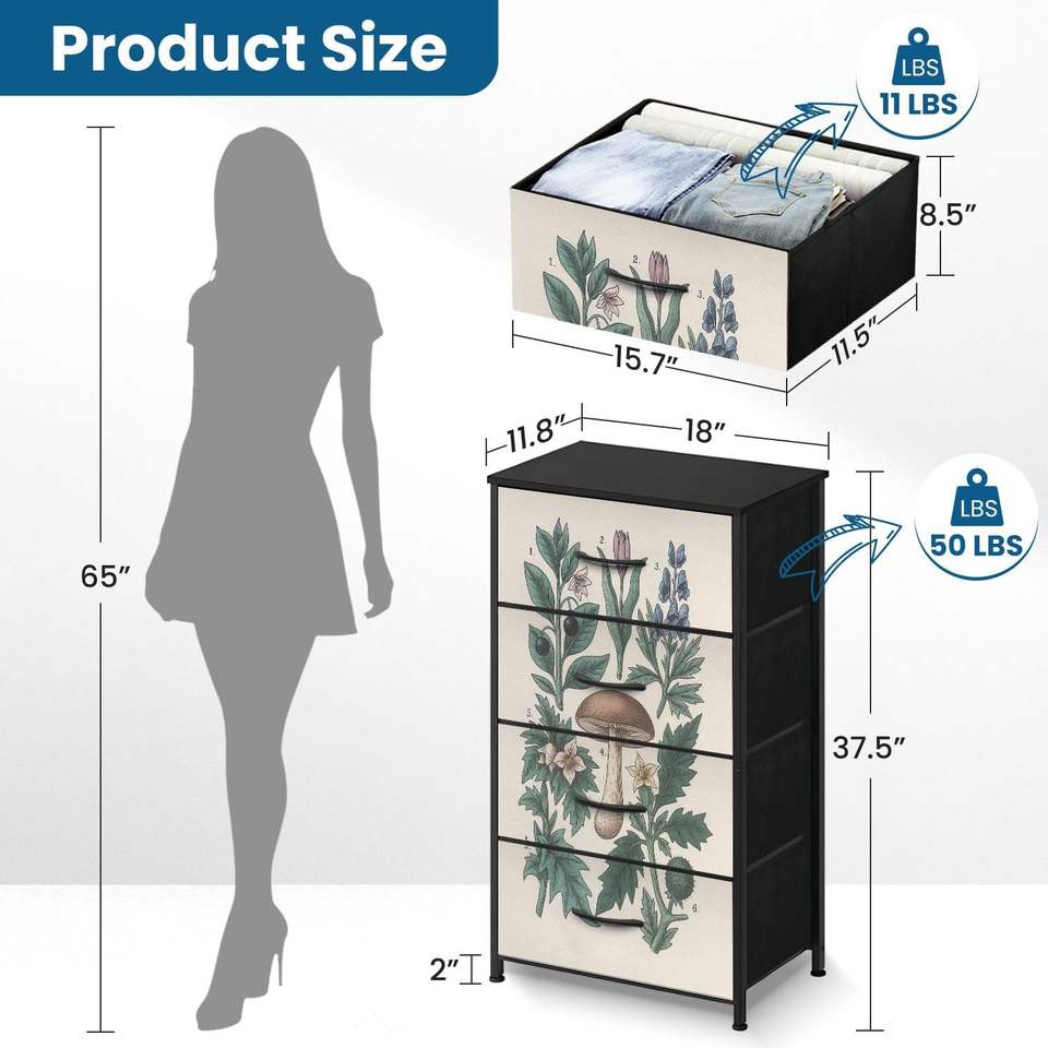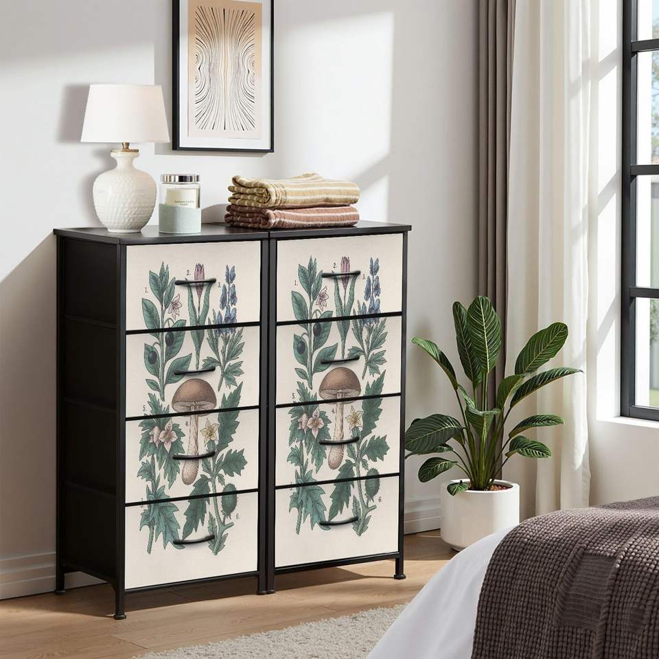 Antique 4-Drawer Dresser with Vintage Plants Lithograph Metal and Oak Bedroom Furniture Home Decor Closet Organizer Stock