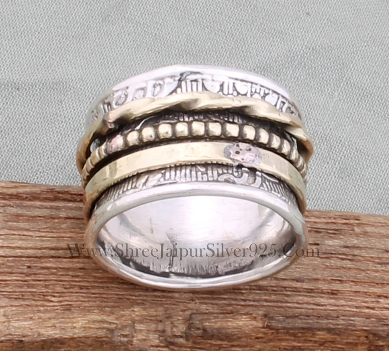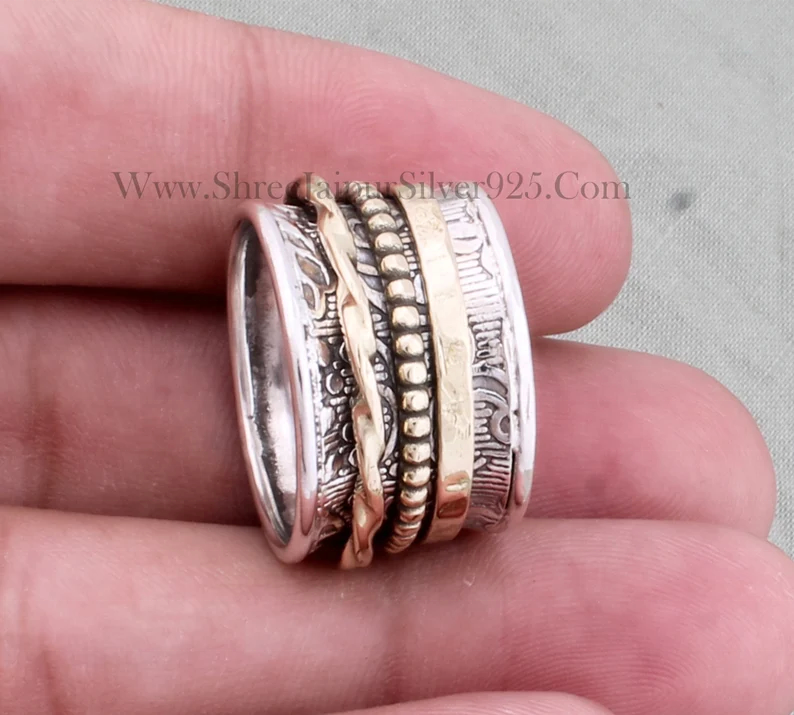 Antique 925 Sterling Silver Spinner Ring Engraved Two-Tone Wedding Band Solid Silver Hot Gift Item