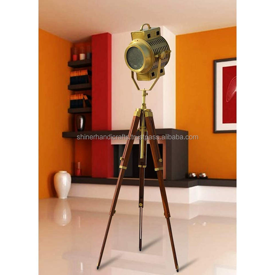 Antique Brass Spotlight Farmhouse Wood Tripod Stand Floor Lamp Industrial Tall Standing Lamps Bedroom for Living Room Home Decor