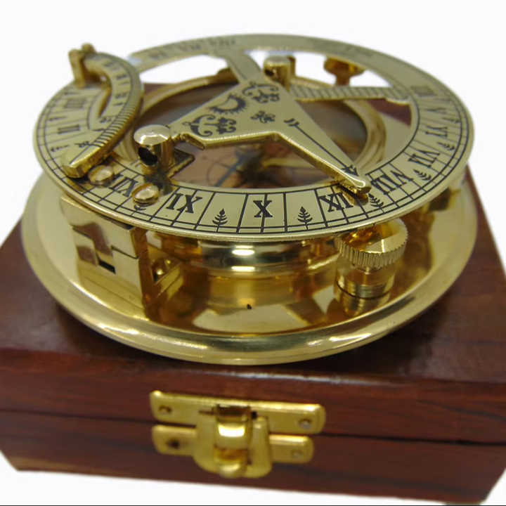 Antique Brass Sundial Compass with Carved Engraved Lid Gold-Plated Wooden Box Timeless Nautical Model for Collectors Explorers