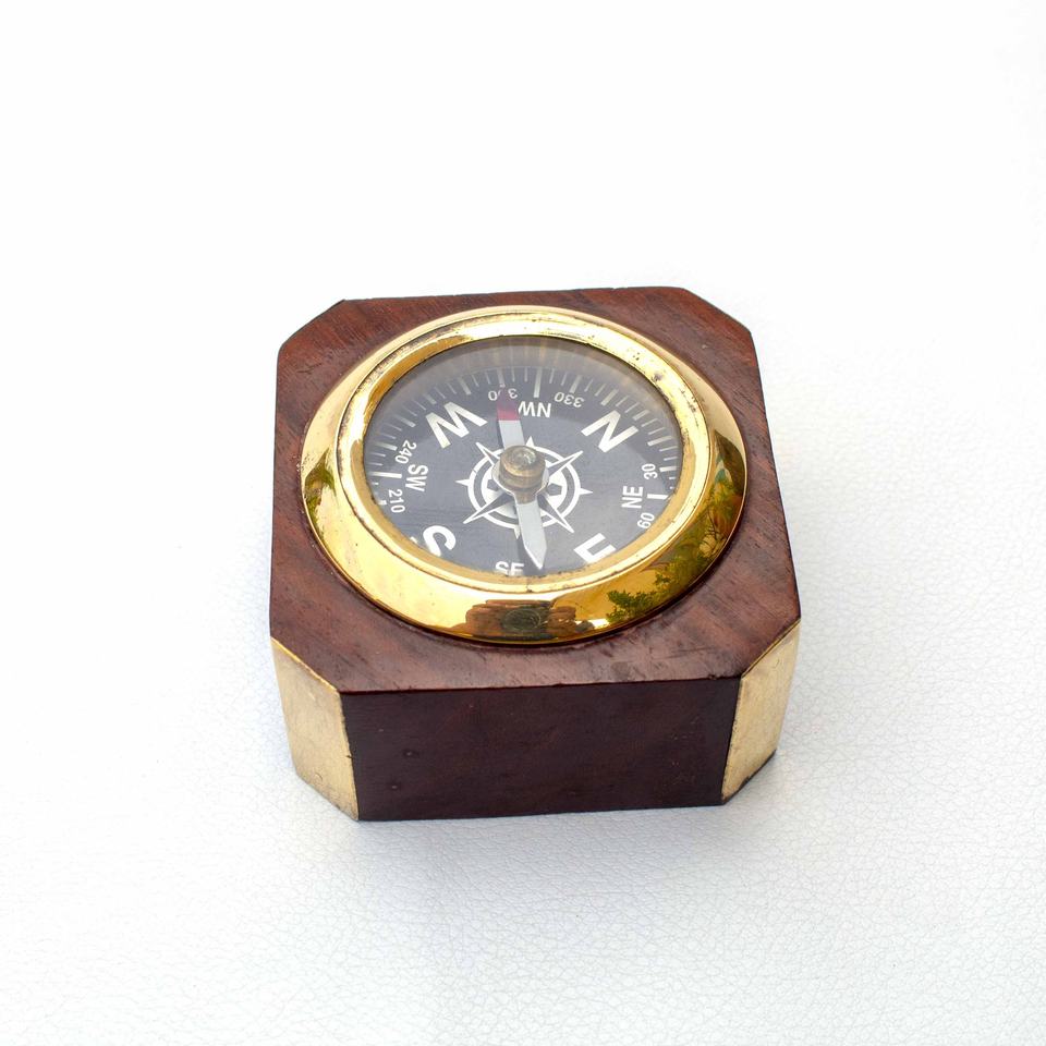 Antique Brass Wooden Nautical Compass 2\" Metal and Glass Directional Paperweight Made of Alloy