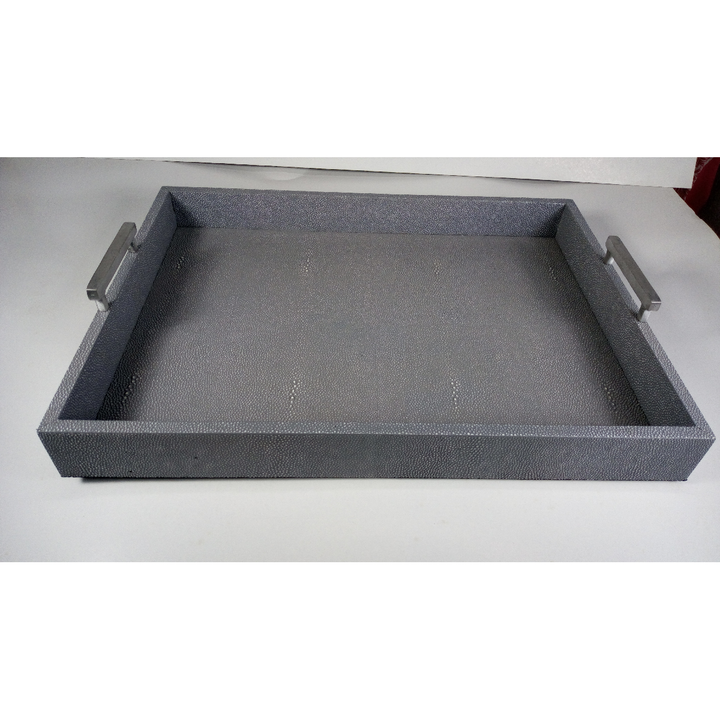 Antique Charcoal Color 0.62x0.49x0.09 Veneer Edges Tampered Brass Handle Faux Shagreen Rec Tea Tray