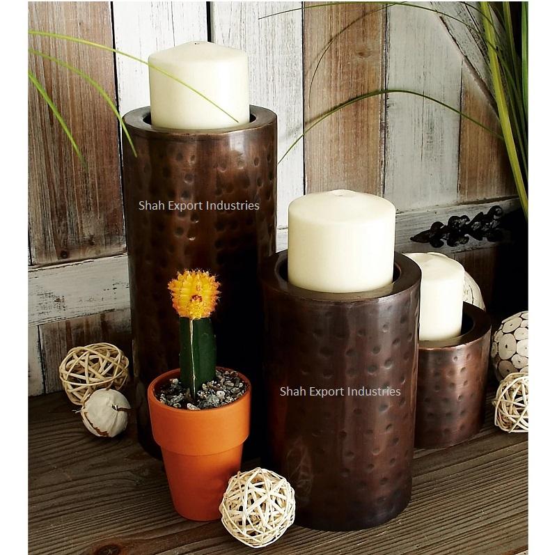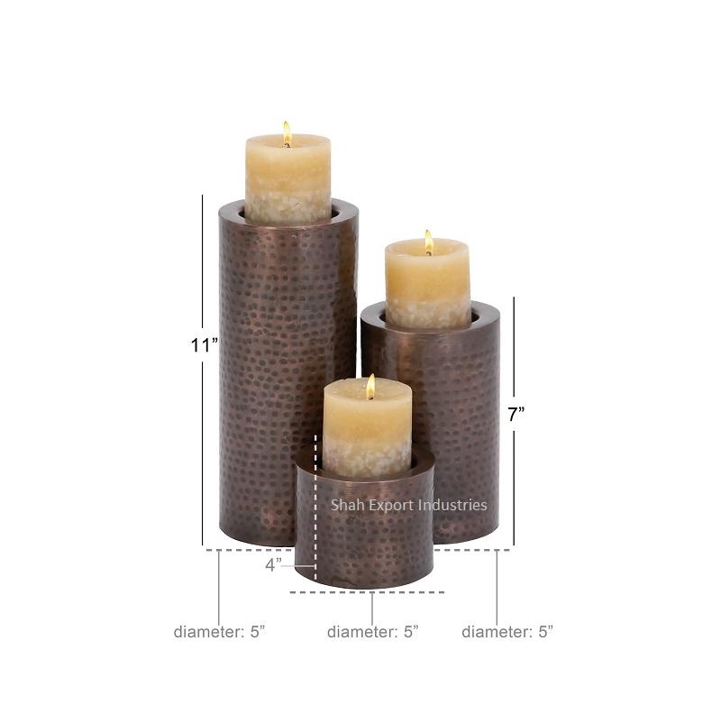 Antique Copper Dining Table Decorative Metal Candle Pillar Set Hammered Design Cylindrical Pillar Candle Holder for Christmas