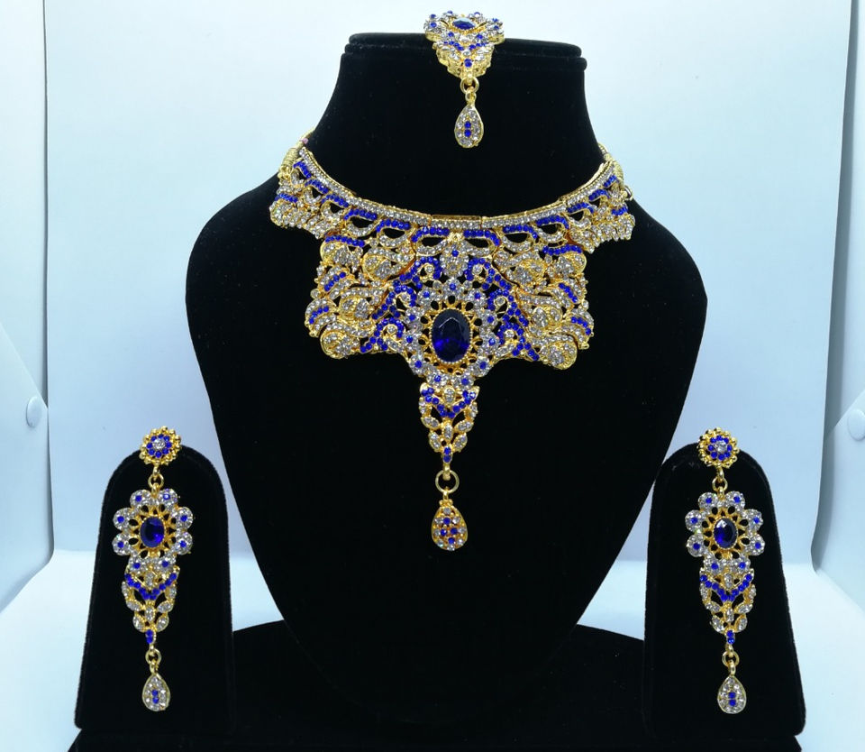 Antique Crystal Rhinestone Handmade Jewelry with Blue Necklace Earrings Maang Tikka Set Gold Plated for Wedding Occasion
