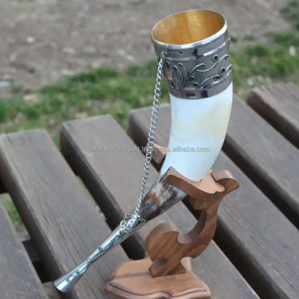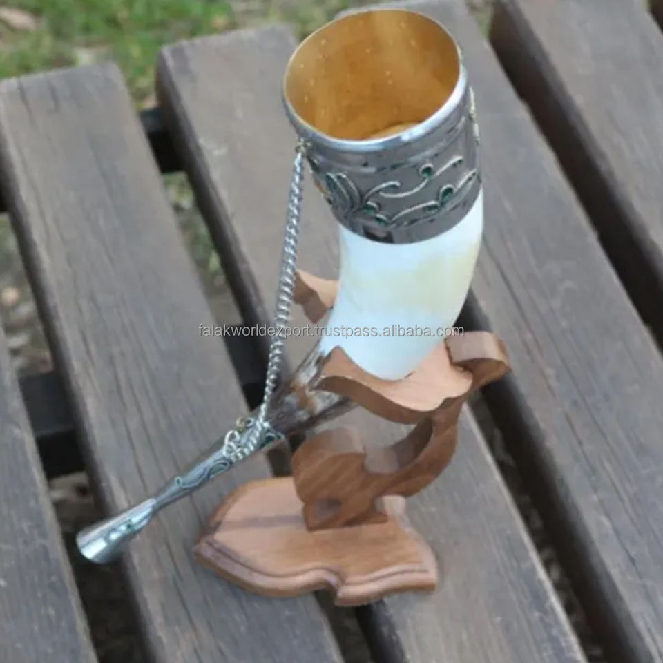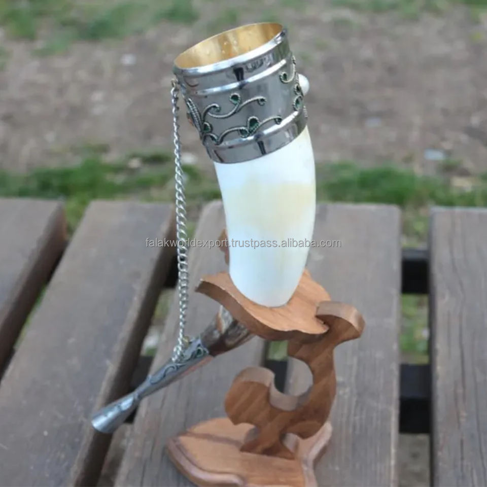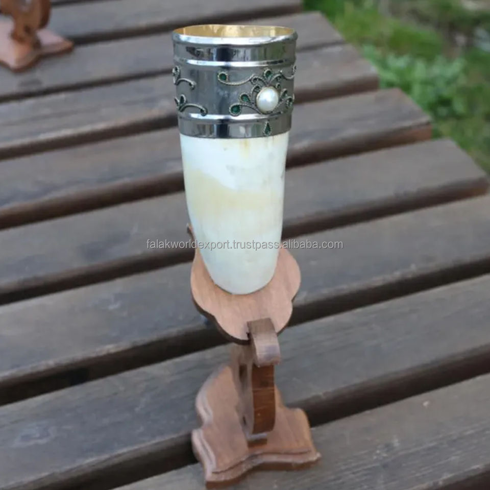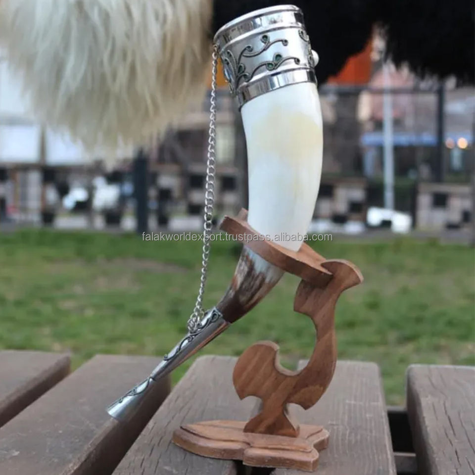 00% Pure Carved Viking Horn with Eco-Friendly Wood Stand Quality Drinking Horn Featuring Animal Style for Wine Beer Bowling FWE