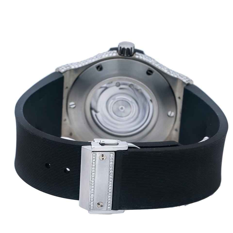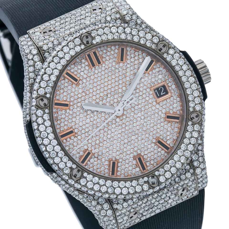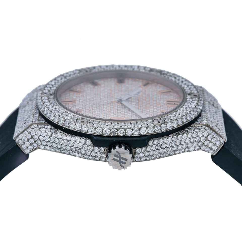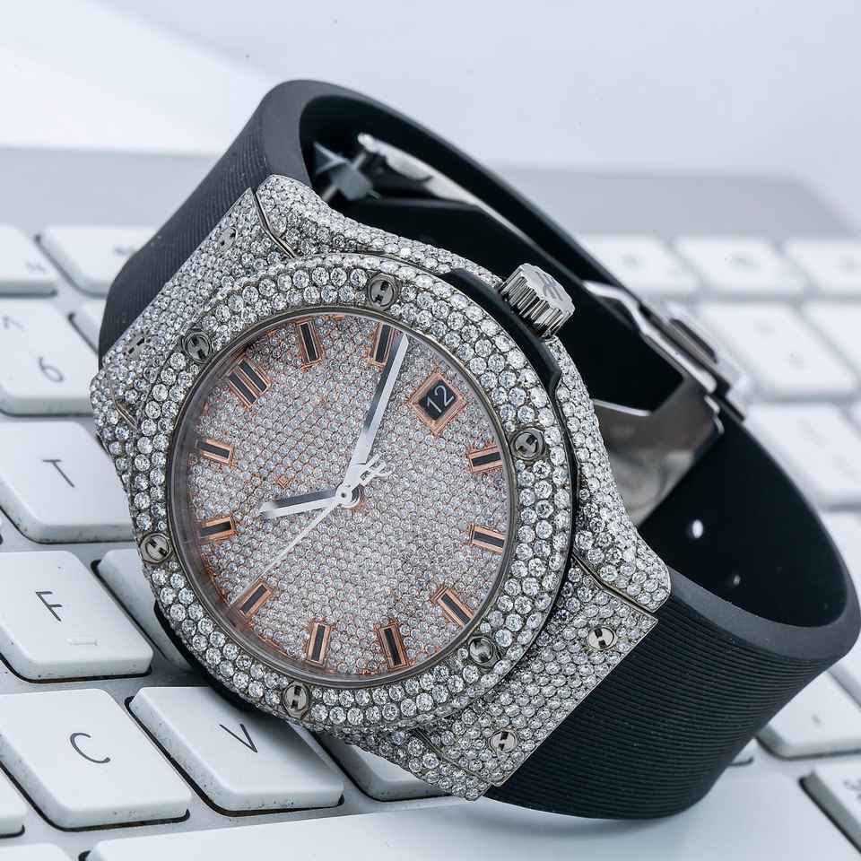 Antique Fashion Round Cut Moissanite Diamond Studded Iced Rose Gold Stainless Steel Dial Automatic Black Rubber band Watch