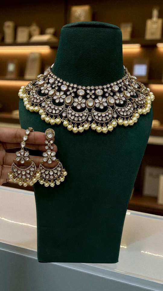 Antique Finish Diamond Look Choker Set with Pearl Jhumkas High Quality Ethnic Wedding Jewelry Brass Moon Shape Bezel Setting