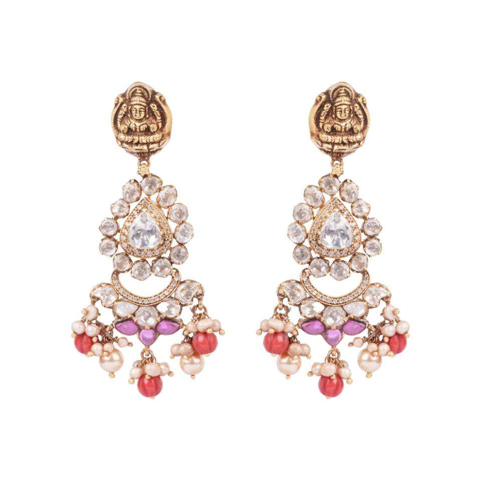 Antique Gold Mahalakshmi Chandbalis Designed In Gajaah 925 Sterling Silver With Red Pearls And Coral Drops
