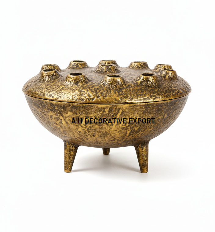 Antique Gold Metal Tripod Flower Frog Planter-Modern Style Wedding Eco-Friendly Ikebana Vase with Multi-Hole Decorative Design