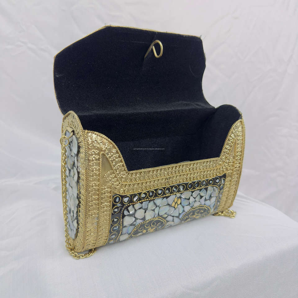 Antique Gold Vintage Style Aluminium Mosaic Handmade Clutch Sling Bag Modern Design Polished Sculpture Chip Stone Purse Stylish