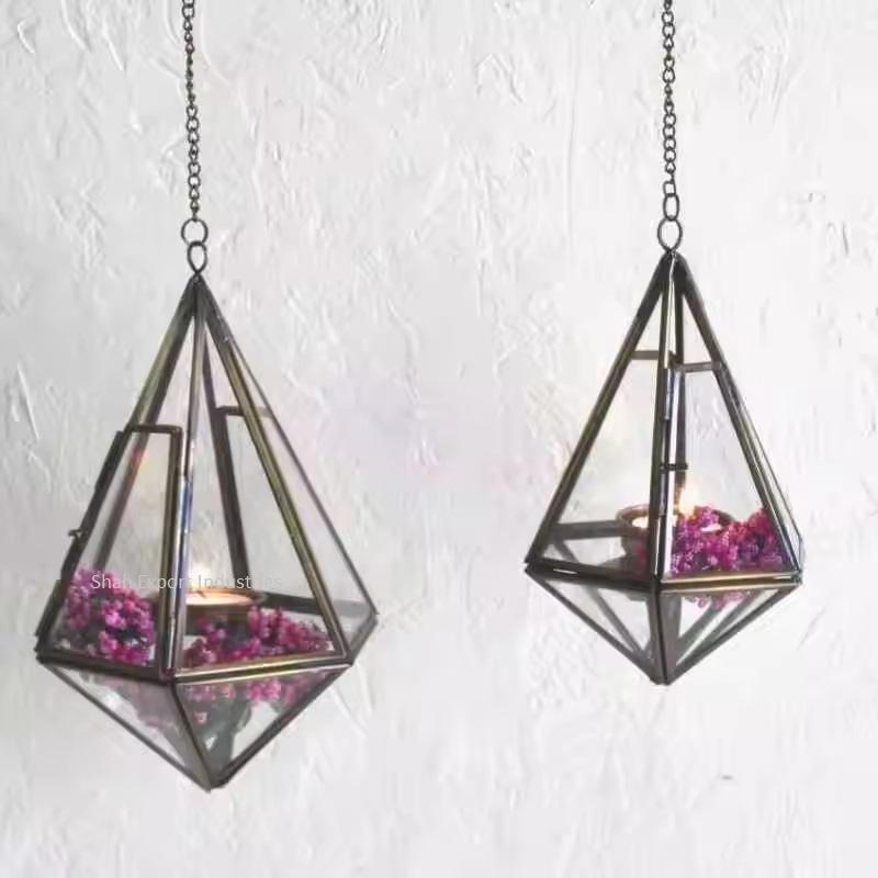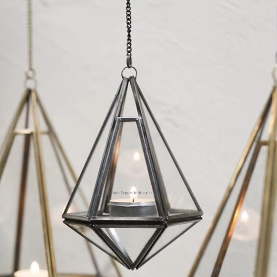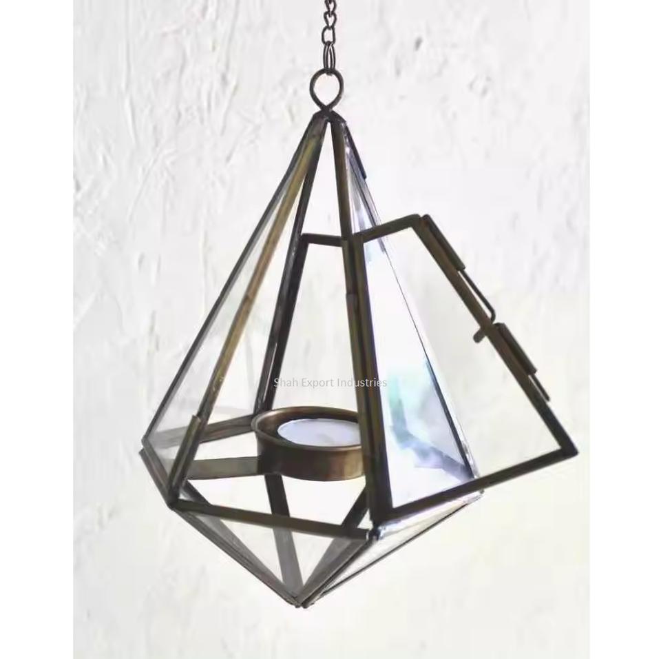 Antique Grey Metal and Glass Tea Light Holder Geometric Shape for Home and Garden Hanging Lighting Decorations