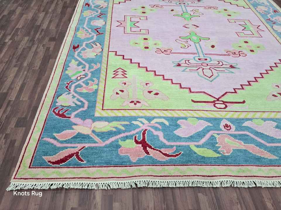 Antique Handknitted Cotton Oushak Rug 8x10 Low Pile Foam Backed PET Friendly Pink Green High Quality Traditional Living Bathroom