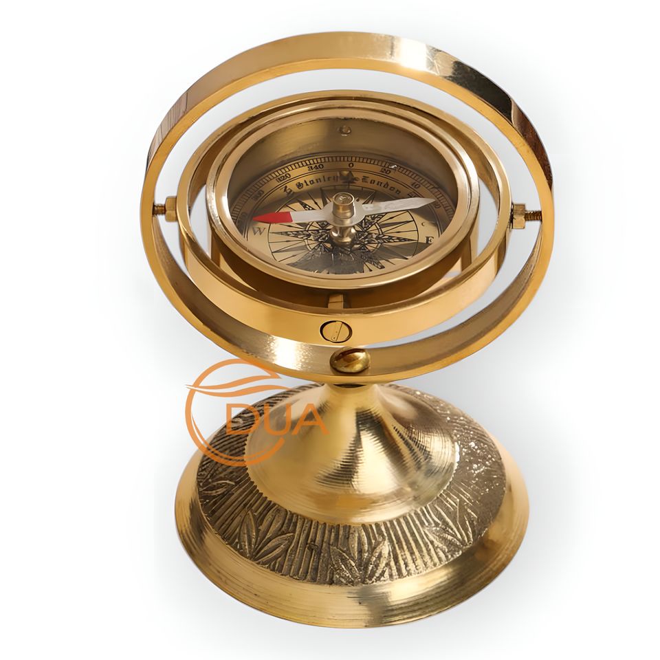 Antique Maritime Brass Gimbaled Compass Rotating Base Nautical Desk Decor Piece for Home Office Navigation Features Pointer Dial