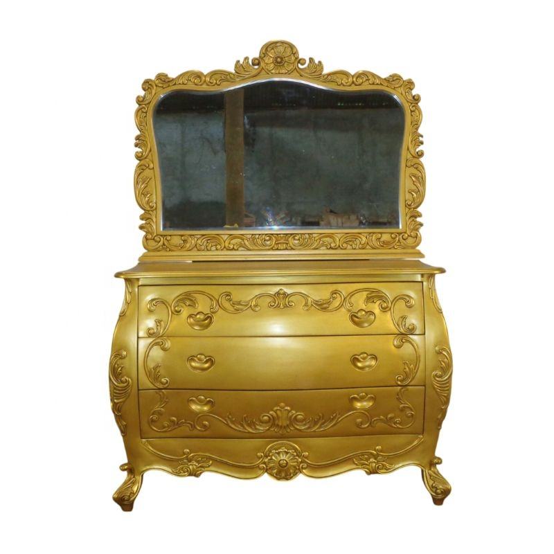 Antique Reproduction Bedroom Furniture Set Finished in Gold Painted Wood Color and Upholstered Bedhead in Synthetic Leather