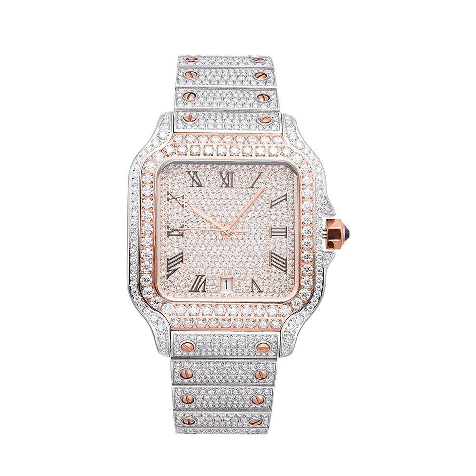Antique Sport Fashion Moissanite Diamond Hip Hop Watch Men Casual Formal Wear Crystal Stainless Steel Case Square Shape 20mm
