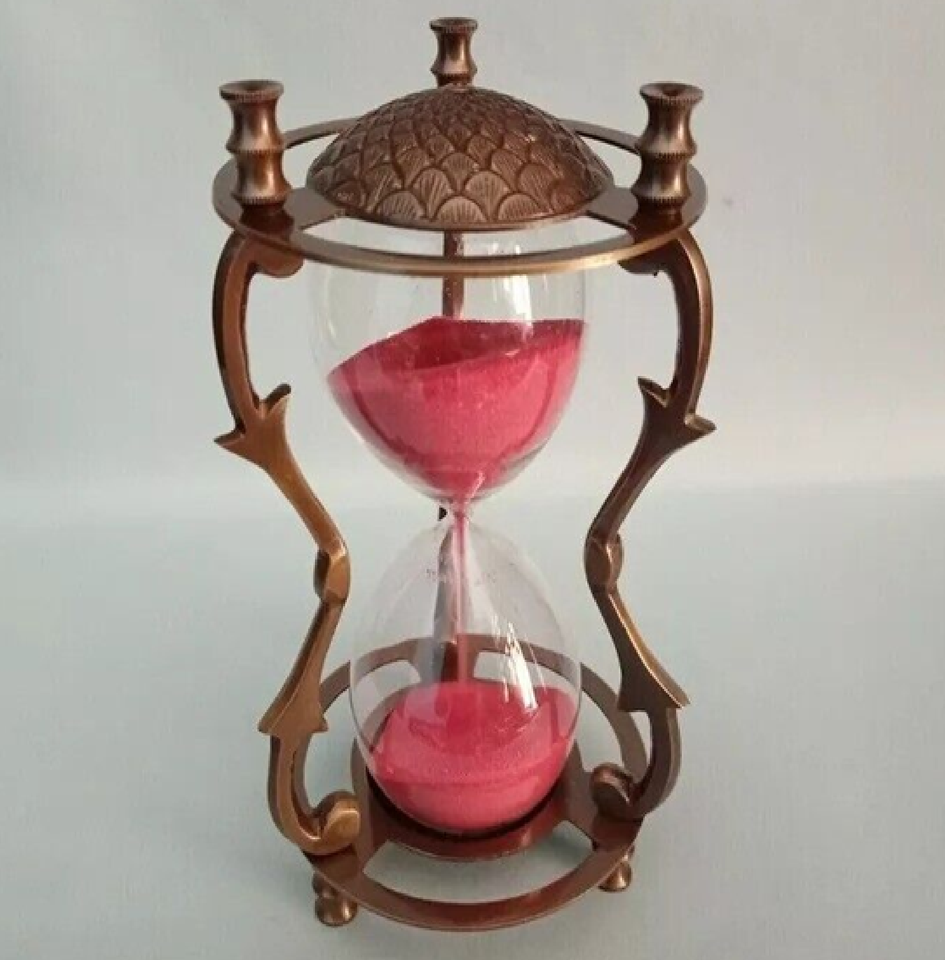 Antique Style Brass Hourglass with Floral Design & White Sand for School Office home Use available at wholesale factory prices