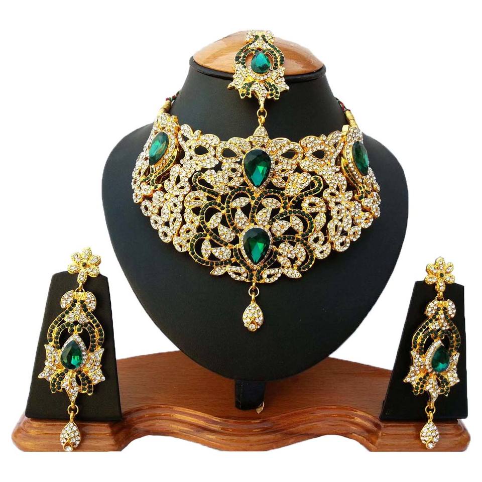 Vintage Crystal Rhinestone Flower Shape Alloy Jewelry Set Necklace Earrings Headpiece Gold Plated Green Women Wedding Party