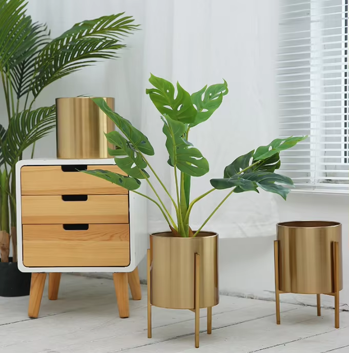 Antique Style Metal Planters Tall Round Tapered Indoor Outdoor Plant Stands Contemporary Gold Chrome Flower Pots Balcony Gardens
