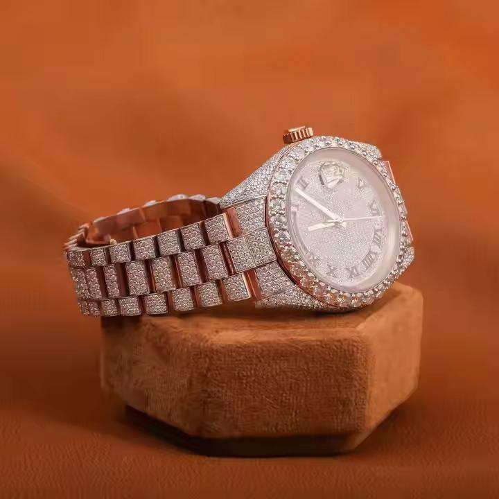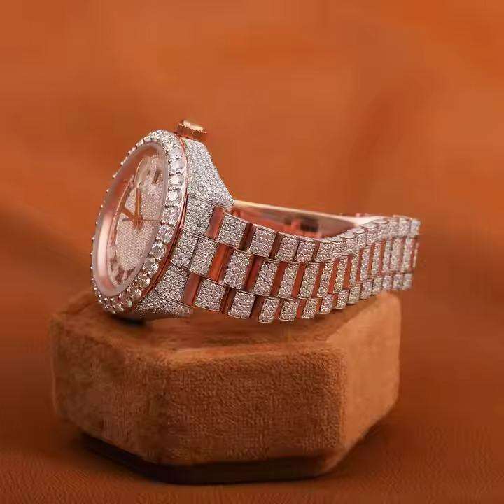 Antique Style Premium Rose Gold Analog Moissanite Diamond ETA Leather Strap Sport Stainless Steel Mechanical Watch Luxurious