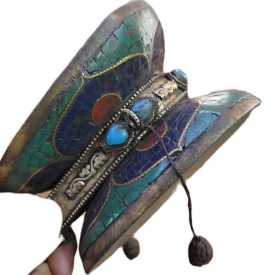 Antique Tibetan Buddhist Hand Carved Damaru Wood Painted Technique