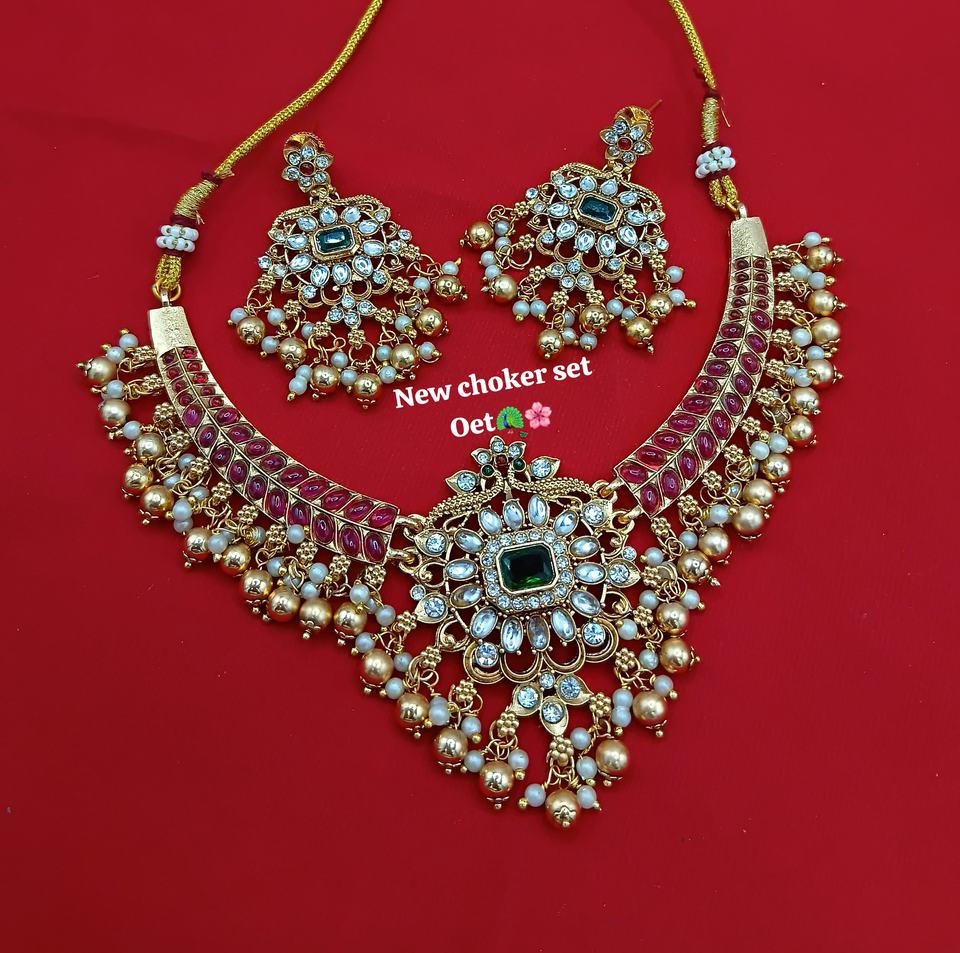 Antique Traditional South Indian Gold Plated Necklace Set with Earrings Stone and Pearl Studded Jewelry for Women Girl Wedding