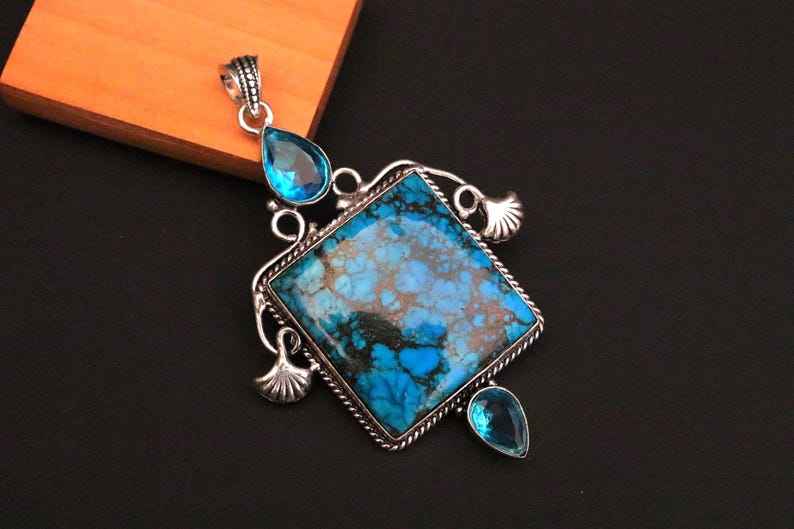 Antique Turquoise Gemstone With Blue Topaz Pendant Necklace Big Beautiful Pendant Anniversary Gifts Jewelry