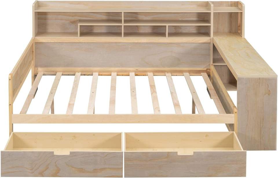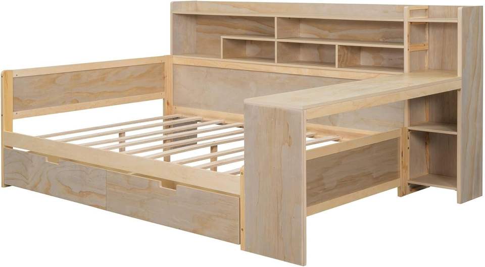 Antique White Natural Solid Wood Full-Size Daybed with Storage Shelves and Two Study Desk Drawers Multi-Functional Bed
