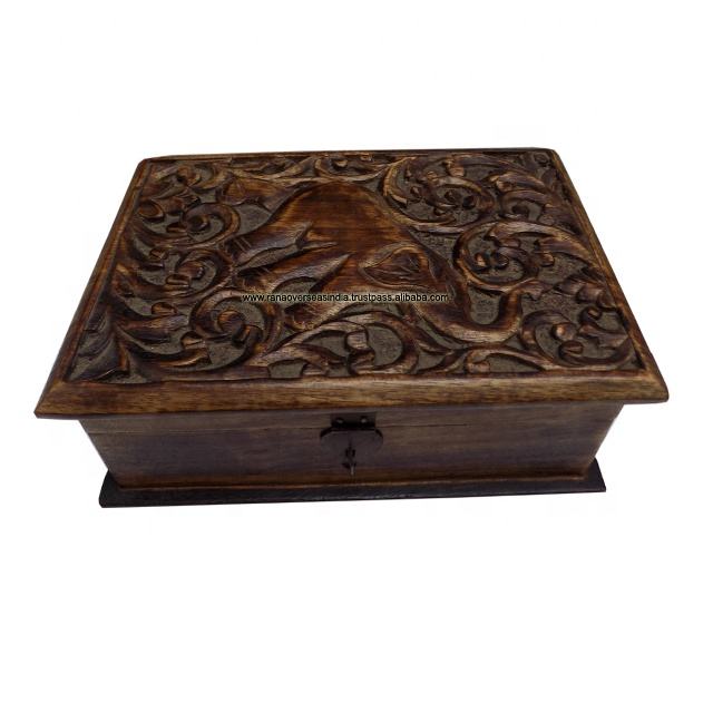 Antique Wood Elephant Carved Trinket Lock Box for Ring Earrings and Necklace Chest Organizer