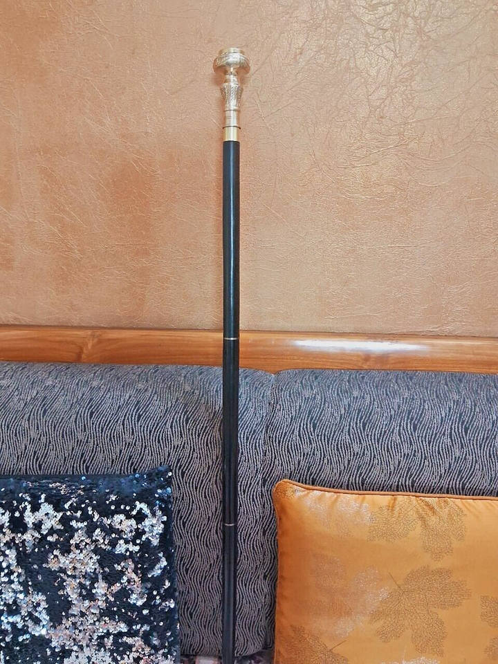 Antique Wooden Walking Stick with Vintage Victorian Solid Brass Handle Compass Carved Hand-Polished Technique