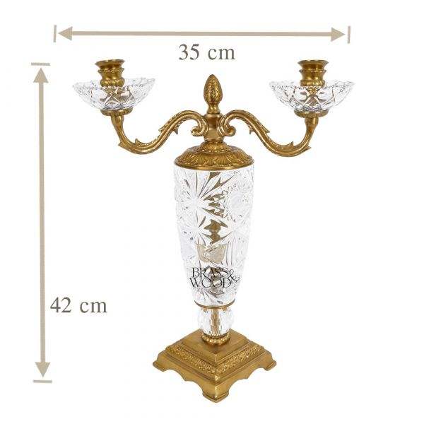 Antique brass and cut crystal two arm candle holder with ornate detailing elegant vintage inspired design and luxurious classic