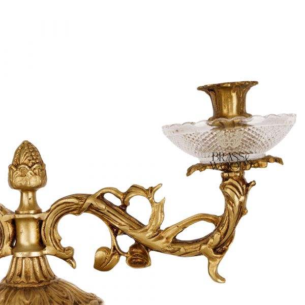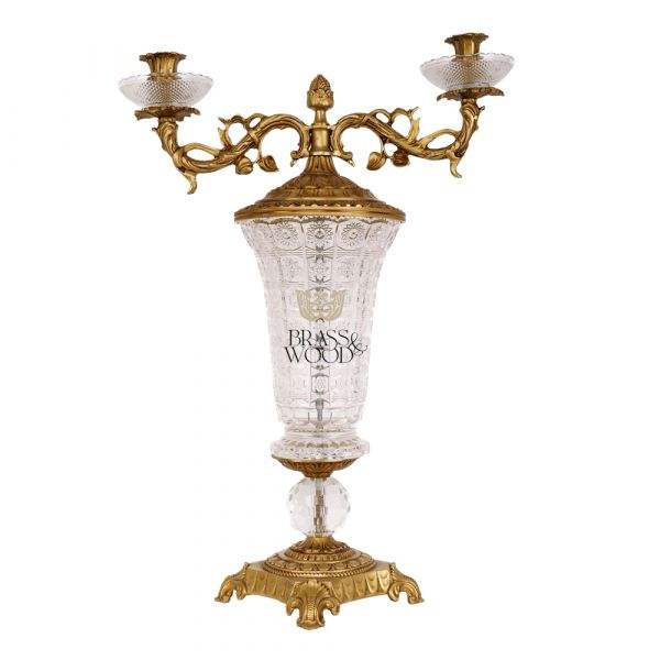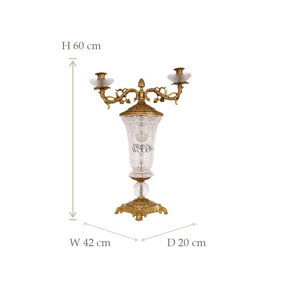 Antique brass and engraved crystal two arm candle holder with ornate detailing elegant vintage inspired design