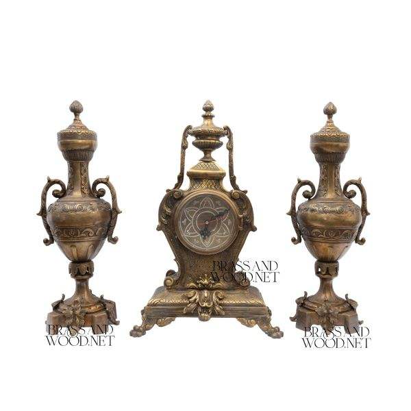 Antique brass clock and urn set ornate aged finish vintage decorative design for elegant luxury home interiors