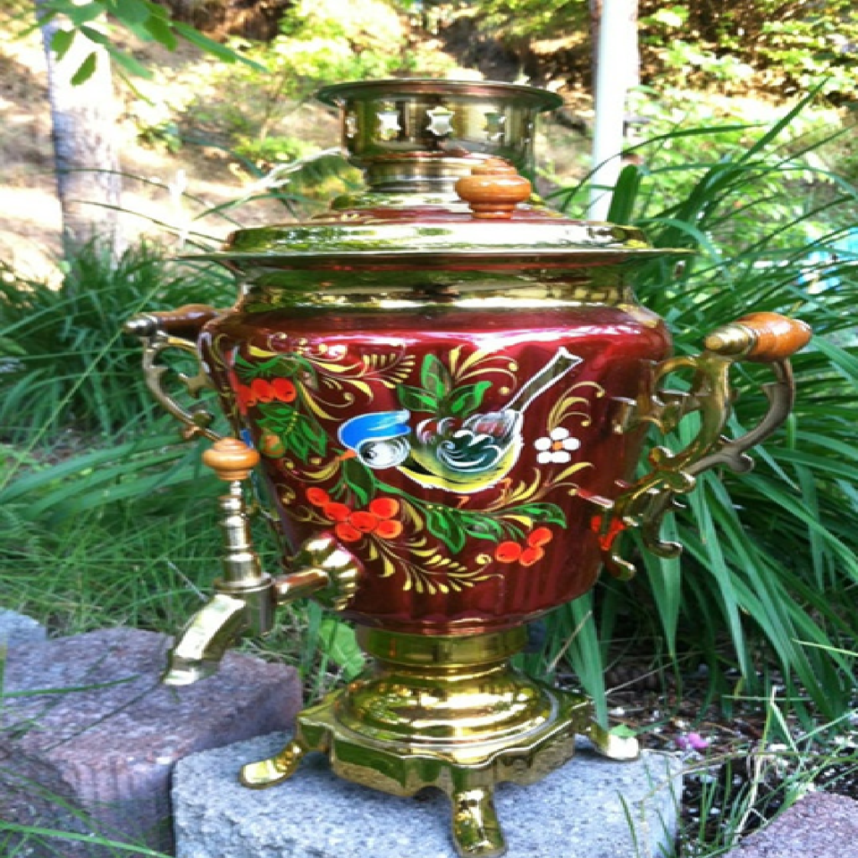 Antique brass samovar and teapot set, decorative floral tray, available at wholesale prices.
