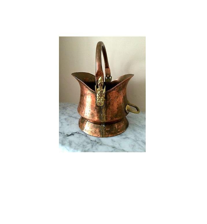 Antique copper coal bucket with natural finish and ergonomic grip great for placing beside fireplaces in rustic or country homes